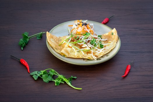 Vietnamská omeleta z výhonků, cibulky, shiitake hub a jidášova ucha, se salátkem z kedlubny a mrkve